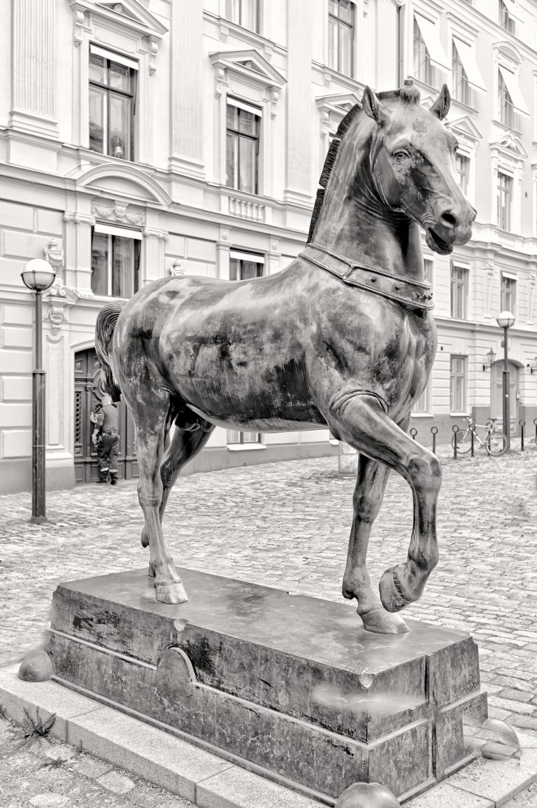 Men nu var det inte gryning, tvärtom. Vädret slår om, himlen förvandlas. På Slottets norrsida är det kallt. Ur ryggsäcken åker halsduken fram. På Blasieholmstorg, för femtioelfte gången, tar jag ett par bilder på en av de två bronshästarna – som om den bar på en hemlighet som bara idogt fotograferande om och om igen kan avslöja. Ja, kanske är det så. Och varför inte? Den tjusning som röjer allt den äger vid första påseendet är väl inte mycket till tjusning.
