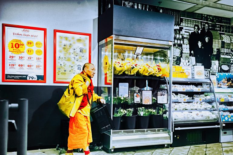 Men – jag hade tur. Vid ingången fick jag syn på en ovanligt klädd man. Buddhistisk munk? Jag hoppades att han, efter att ha fiskat upp en korg, skulle vända profilen mot kameran, mot denna nästan löjligt perfekt färgkorrelerade fond. Nästan som en figurant inhyrd av det snart 150-åriga ”Slagteriaktiebolaget i Stockholm” (numer kortat till akronym), ett av Sveriges äldsta familjeföretag. Jag inväntade ögonblicket och tog bilden. I övre högra hörnet ett stycke kulturhistoria: en vy från när butiken bara var hälften så gammal. Och så var det inte mer med det.